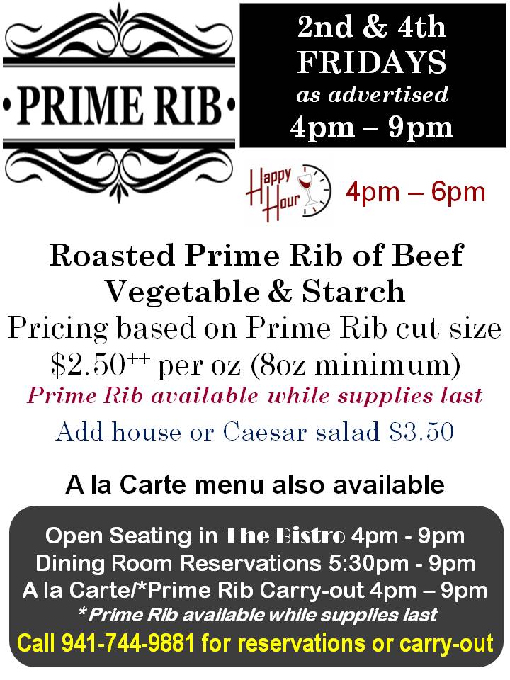 Carry-out available during A la Carte dining - Call 941-744-9881